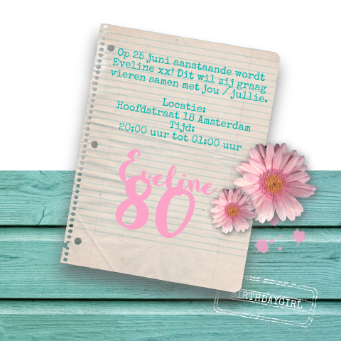 Uitnodiging 80ste verjaardag hout, bloemen en foto